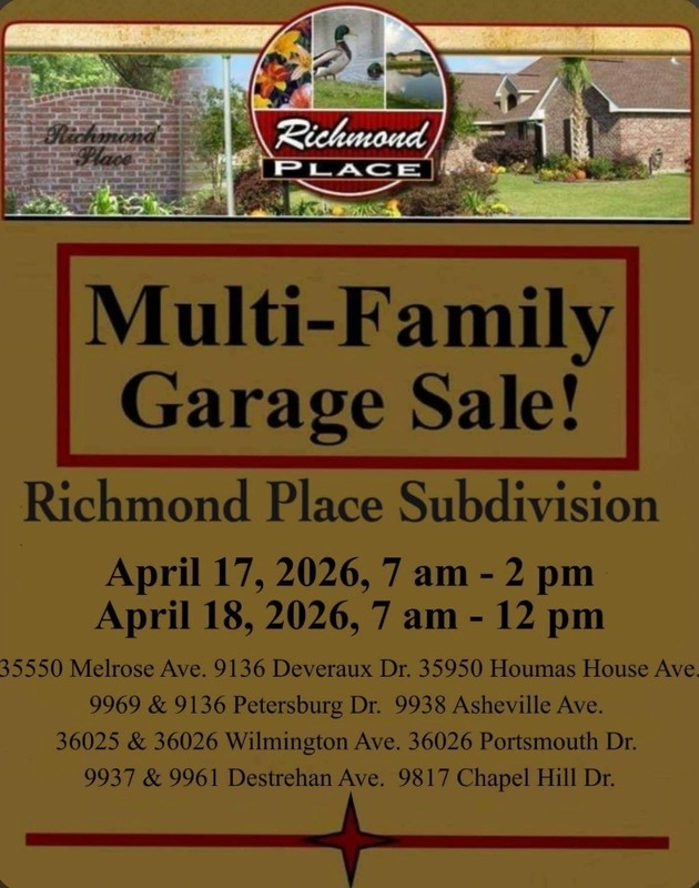 Area 8 Richmond Place Spring Garage sale. We will have 12 homes participating. Many different item for sale; Baby, Girls & Boys clothes, household items, tools. Many more different items also. Friday. 7:00a-2p Saturday. 7:00a-Noon